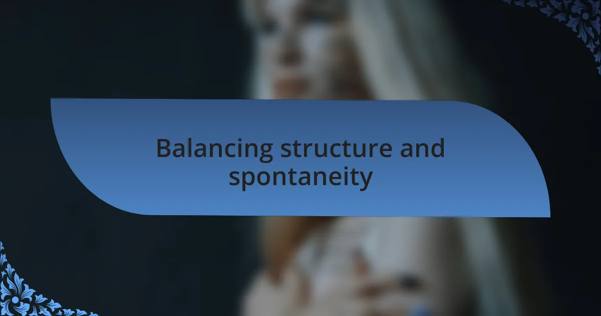 Finding the right balance between structure and spontaneity can be a delicate dance. Some days, I set strict guidelines for my writing sessions, aiming for a specific word count or theme. I recall a time when I adhered to a detailed outline for a poem, only to realize that forcing myself into a rigid format stifled my creativity. Are we sometimes too tied to frameworks that we forget the joy of discovery?