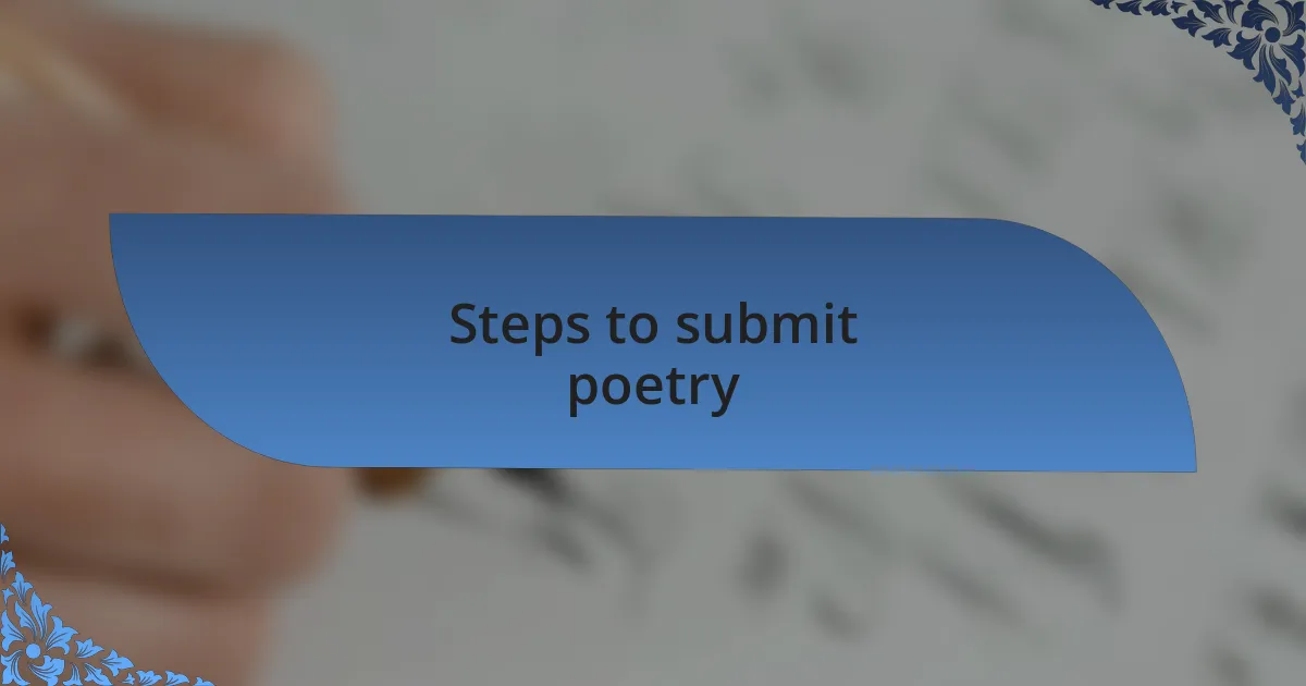 When preparing to submit your poetry, the first step involves carefully reading the submission guidelines of the journal. Each publication has its preferences regarding formatting, themes, and even the number of poems you can submit at once. I once overlooked this detail with a promising piece and learned the hard way that attention to detail is crucial; it can be the difference between acceptance and rejection.