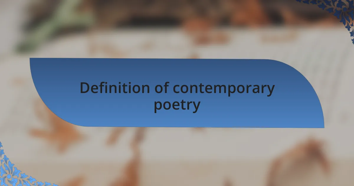 Contemporary poetry emerges from the vibrant fabric of modern life, reflecting the complexities and diverse experiences of today’s society. It often embraces a variety of styles and forms, allowing poets to experiment and express their unique voices. I recall reading a poem by Ocean Vuong that beautifully captured the struggles of identity and belonging in our ever-changing world, making me feel seen and understood in my own uncertainties.