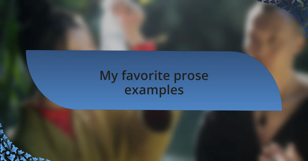 One of my favorite prose examples comes from “The Brief Wondrous Life of Oscar Wao” by Junot Díaz. The way he weaves in pop culture references while exploring themes of identity and family captivates me. I remember the first time I read it, feeling a mix of laughter and heartache as Oscar navigated his dreams in a world that often felt at odds with him. Doesn’t it remind us how cultural roots shape our narratives in unexpected ways?